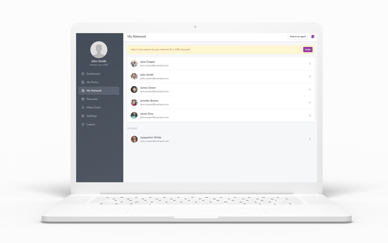 Promotes continuous engagement by providing seamless access for customers to their profile, policies, rewards, and claims. Increases customer satisfaction through round-the-clock support and access to reward systems. Incentivises customers to invite their friends through the proprietary Viral Outreach System (VOS). Gives you the opportunity to market and onboard new products to ready-made, engaged audiences.Serves as a central platform for additional customer services such as telematics and community partner rewards.